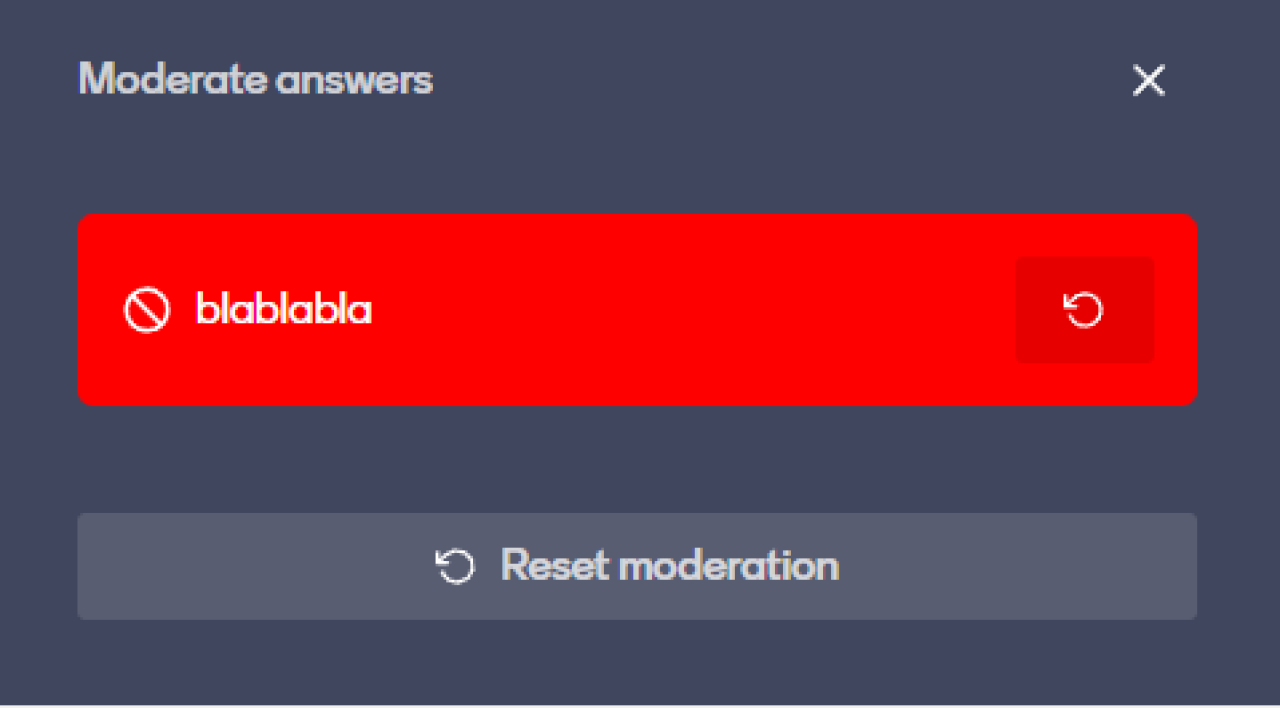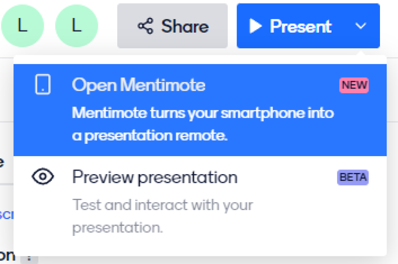 Vor allem in den jüngeren Altersklassen habe ich die Erfahrung gemacht, dass eine Moderation der Antworten nützlich sein kann. Um die Moderation zu öffnen, klickt man auf den Pfeil neben „Present“ und dann auf „Open Mentimode“. In einem neuen Tab kann nun die Moderation ausgewählt und unerwünschte Beträge gelöscht werden. Aus Versehen aussortierte Beiträge können auch zurückgeholt werden.