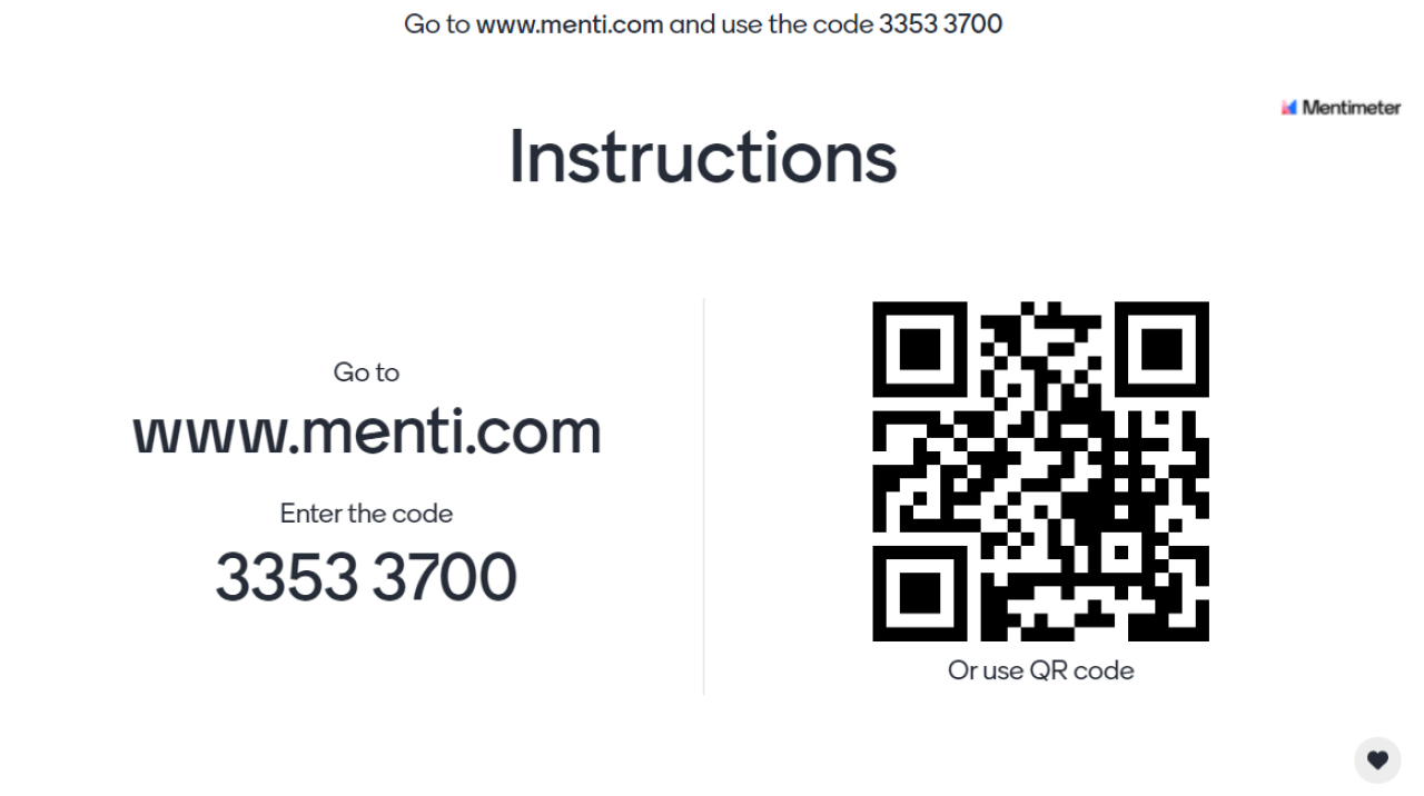 Sobald man bei Mentimeter angemeldet ist, erstellt man eine neue Präsentation. Neu bei Mentimeter ist die Anleitungsfolie. Auf dieser sind URL und Zugangscode abgebildet, sowie einen QR-Code, der direkt zur Eingabemaske führt.