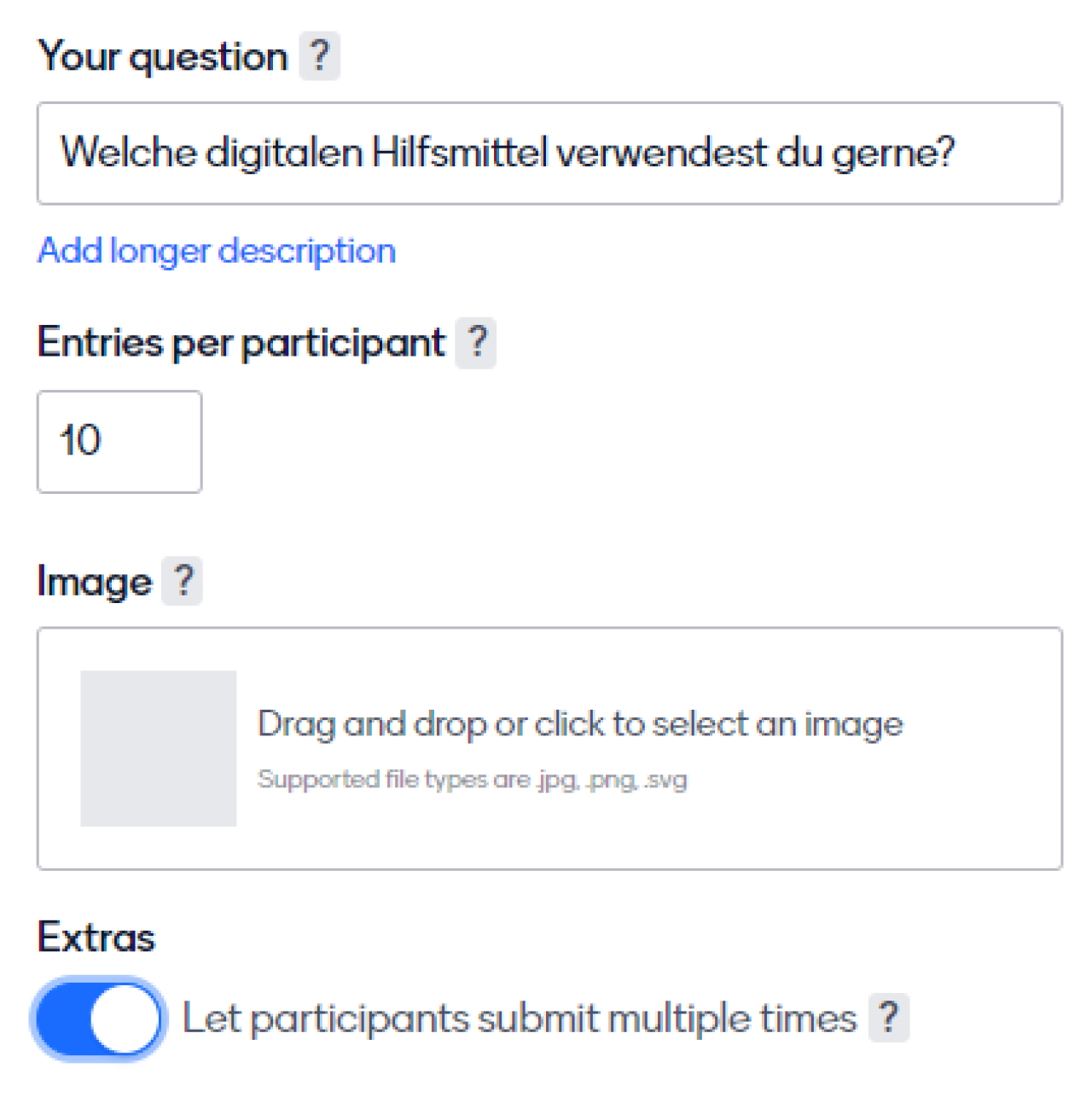 Die Ansicht spring automatisch auf „Content“. Hier wird die Frage eingegeben. Außerdem kann eingestellt werden, wie viele Wörter geschrieben werden dürfen. Zudem kann zugestimmt werden, dass von einem Gerät mehrfach abgestimmt werden kann. Das ist vor allem dann sinnvoll, wenn sich die Lernenden ein Gerät teilen und man viele Worte sammeln will.